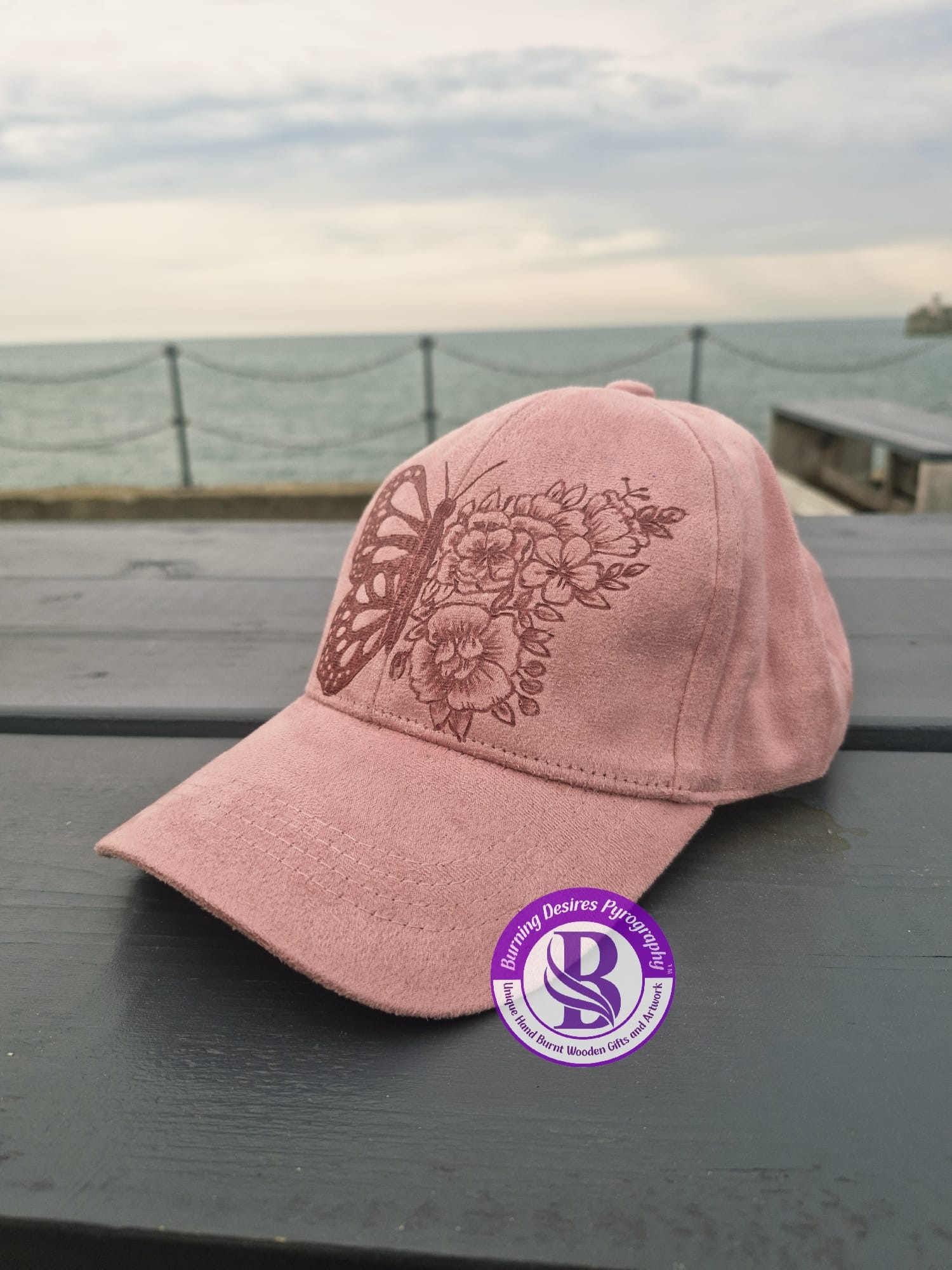 Unique hand-burnt baseball cap.